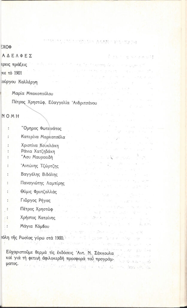 Οι τρεις αδελφές του Άντον Τσέχωφ Έτος: 1985 Λίγα λόγια για το έργο Το 1985 με τον ίδιο θίασο σκηνοθετεί την παράσταση «Οι τρεις αδελφές» του Α. Τσέχωφ. Το έργο διαδραματίζεται σε μια επαρχιακή πόλη της Ρωσίας και αφορά τη διάψευση των ελπίδων και των επιθυμιών των ανθρώπων από την καθημερινότητα και το βάρος της…